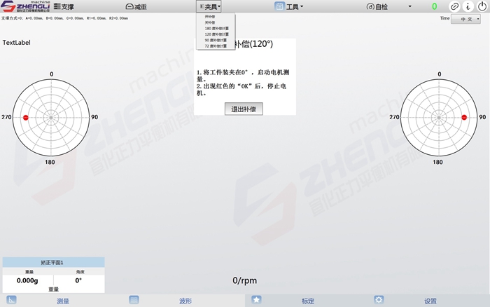【左均布个数】、【右均布个数】表示工件的一个圆周内等分的个数;比如对于三页叶片的动平衡输入3,在平衡检测页面中显示等分角度线并自动将去重或增重结果计算到其中的两个叶片上。
